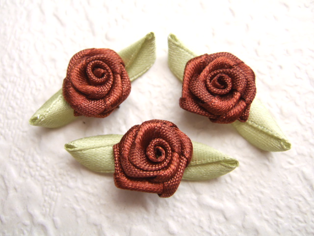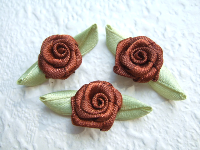 Prachtige bruine satijnen roosjes met groene blaadjes.