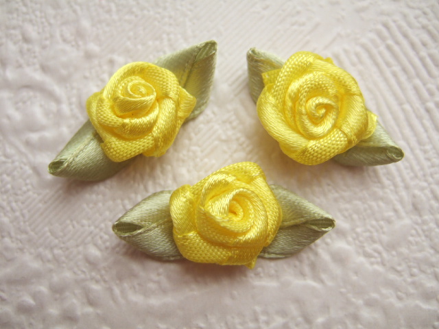 Prachtige helder gele satijnen roosjes met groene blaadjes.