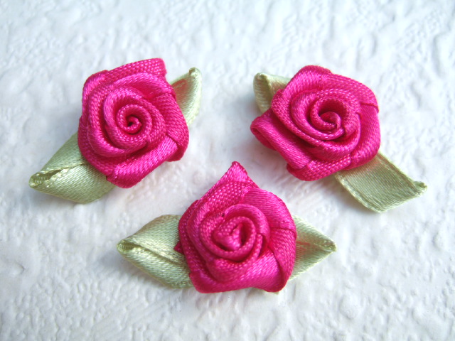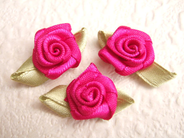 Prachtige fuchsia paars-roze satijnen roosjes met groene blaadjes.