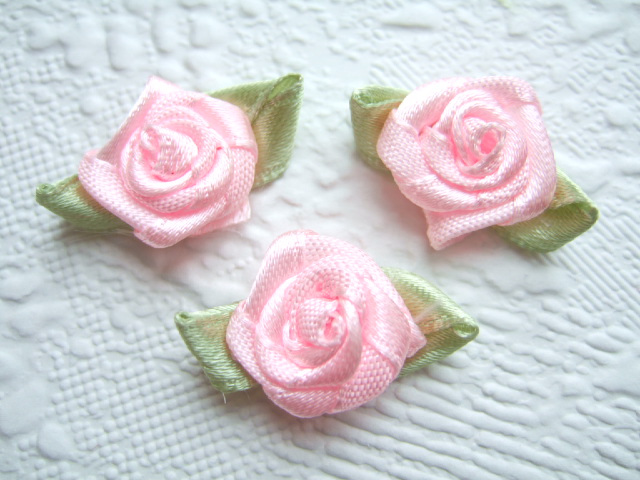 Prachtige zacht roze satijnen roosjes met groene blaadjes.