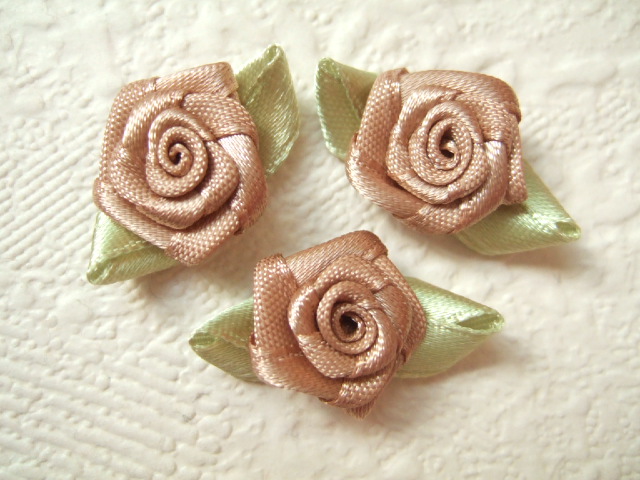 Prachtige mokka satijnen roosjes met groene blaadjes.