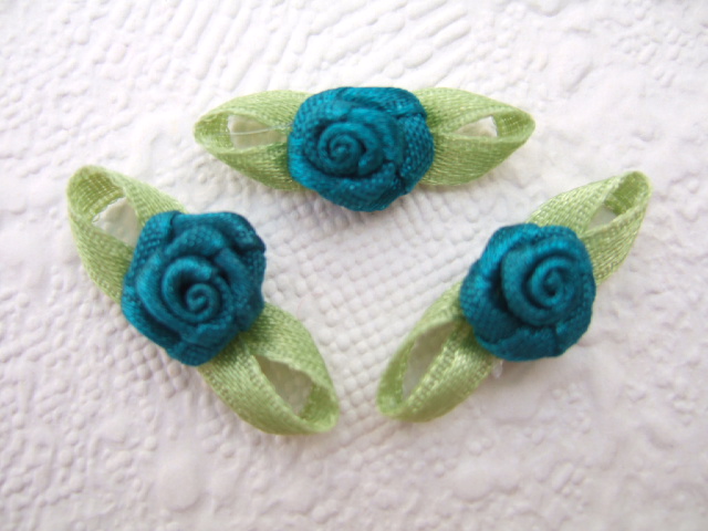 Prachtige donker blauw-groene satijnen roosjes met groene blaadjes
