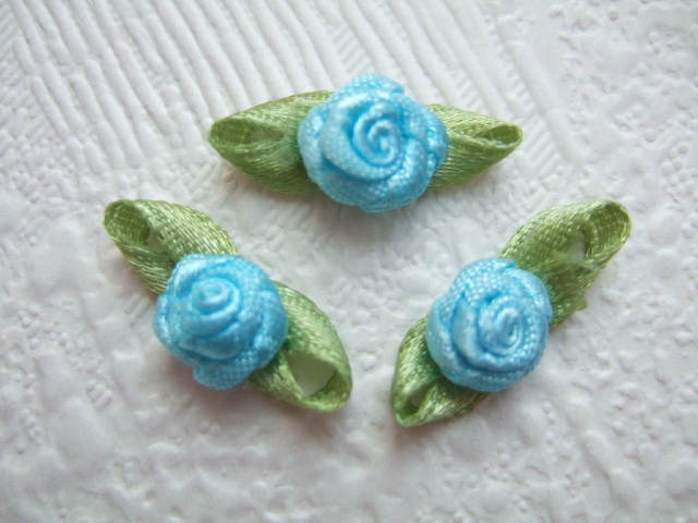 Prachtige licht aqua blauwe satijnen roosjes met groene blaadjes