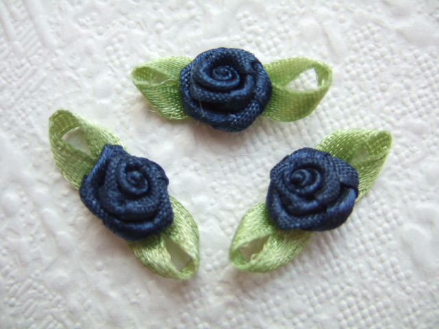 Prachtige donker blauwe satijnen roosjes met groene blaadjes
