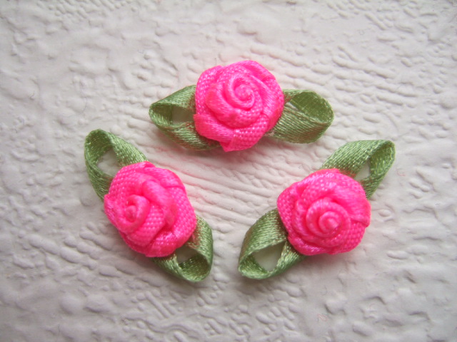 Prachtige fel neon roze satijnen roosjes met groene blaadjes.