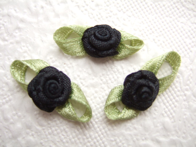 Prachtige zwarte satijnen roosjes met groene blaadjes.