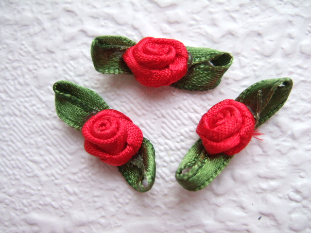 Prachtige rode satijnen roosjes met donker groene blaadjes.