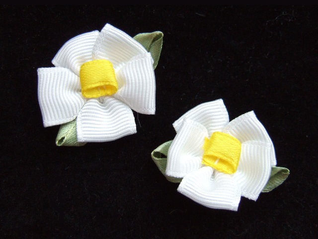 Leuke bloemen van wit grosgrain band, met een geel hartje.