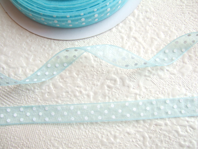 Mooi fijn organza band, licht blauw met witte polka dots.