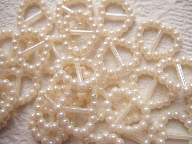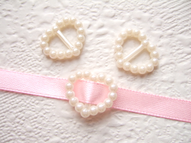 Lieve gespjes van crème “parelmoer” hartjes , waar je een lintje door kan vlechten.