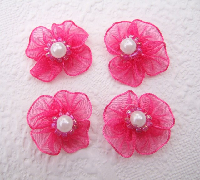 Schattige fuchsia roze organza bloemen met een hart van een parel kraal met kleine roze kraaltjes eromheen.