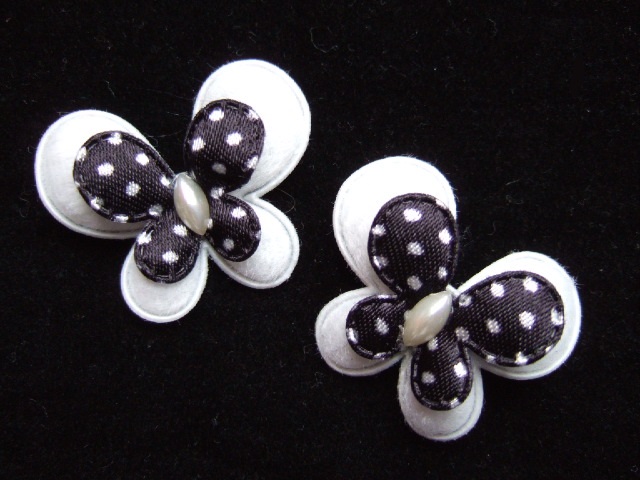Het lijfje is van wit kunst vilt, de vleugeltjes van zwarte satijn met witte stippen.