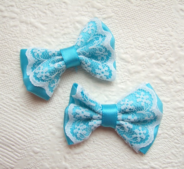 Prachtige aqua blauwe satijnen strikjes, afgewerkt met fijn wit kant.