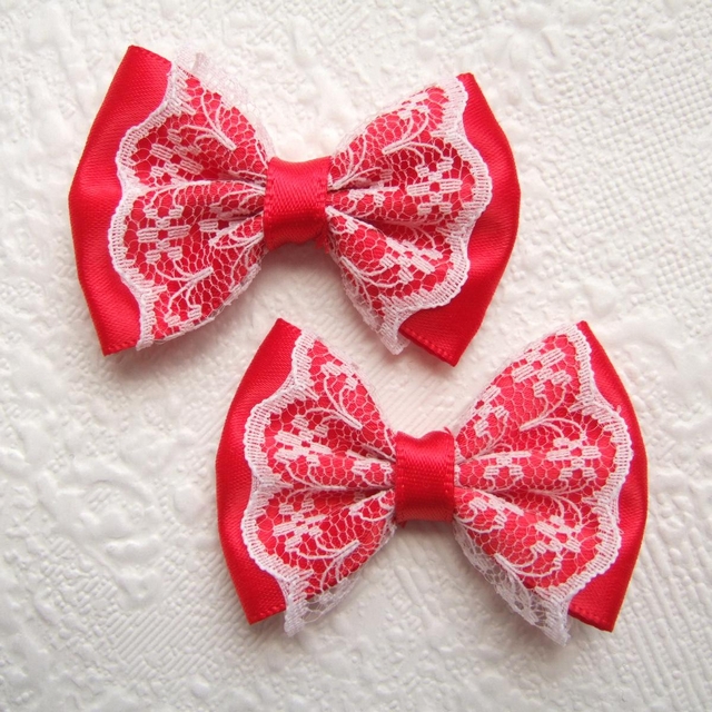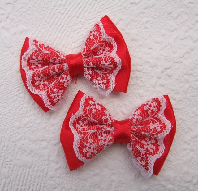 Prachtige rode satijnen strikjes, afgewerkt met fijn wit kant.