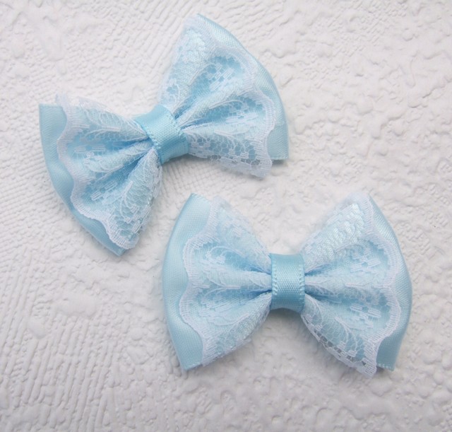 Prachtige licht blauwe satijnen strikjes, afgewerkt met fijn wit kant.