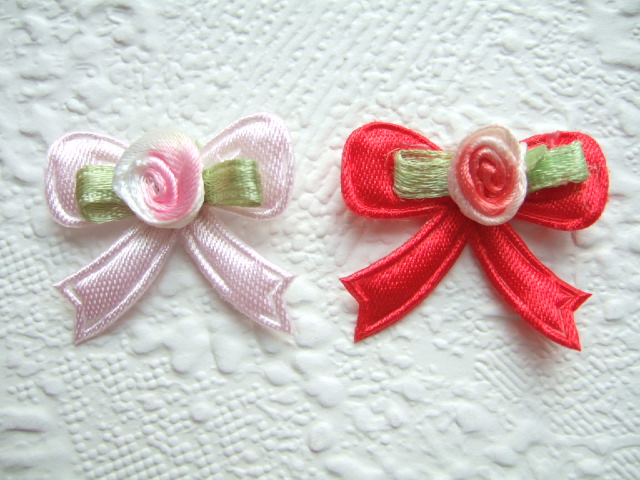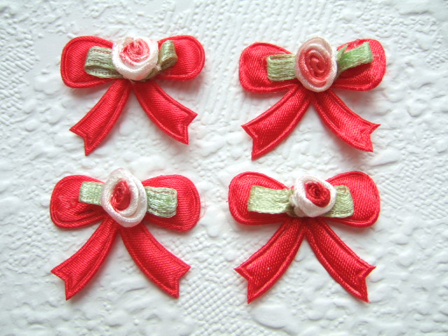 Lieve rode satijnen padded strikjes met een roze-rood satijnen roosje.