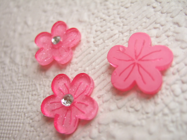 Mooie glanzende roze kunststof bloemetjes met iets glinster erin, met in het midden een strass steentje.