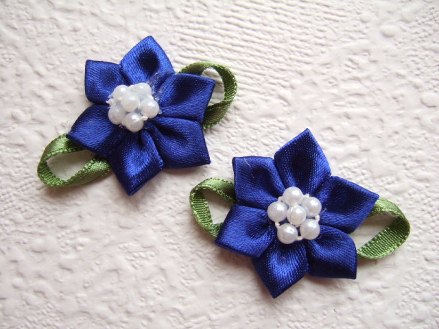 Satijnen bloem op blad, met wit parel hart ~ 3 cm ~ Konings blauw
