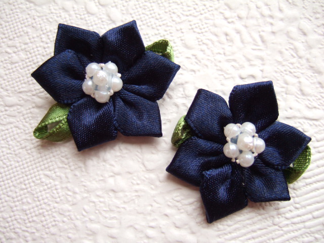 Prachtige donker blauwe satijnen bloemen op een groen satijnen blad.