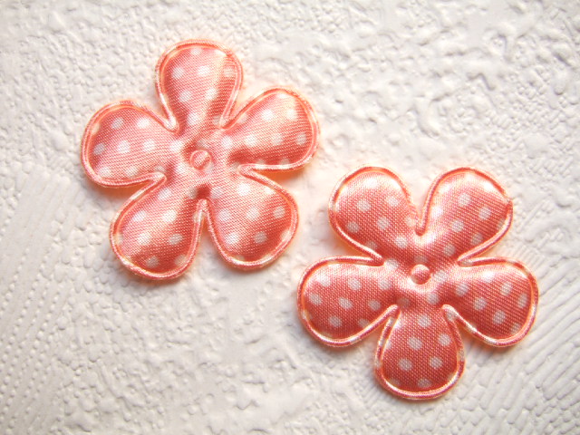 Mooie gevulde bloemen van satijn, peach / zalm roze met witte polkadots.
