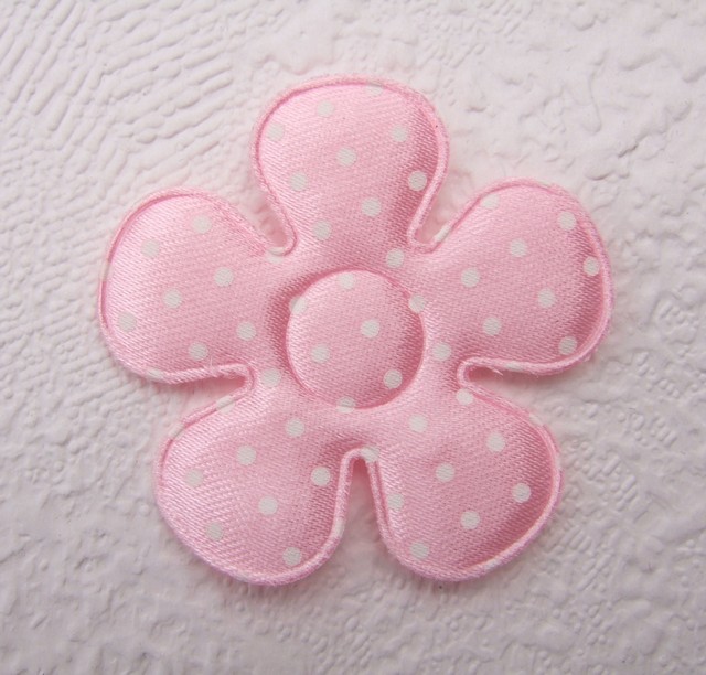 Mooie gevulde satijnen bloemen, roze met witte polkadots.