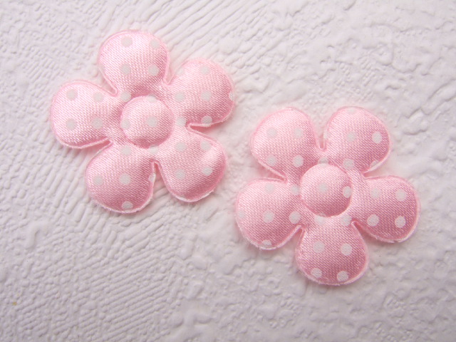 Mooie gevulde satijnen bloemen, roze met witte polkadots.