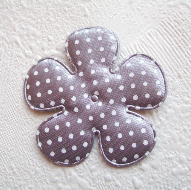Hele grote gevulde satijnen bloem, grijs met witte polkadots.