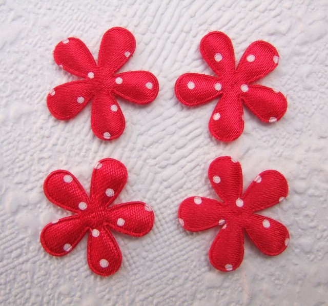 Iets gevulde rode satijnen bloemetjes met witte stippen.