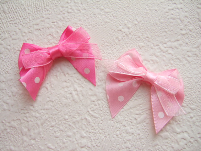 Lieve satijnen strikken met grote witte stippen, met erop een organza strikje.
