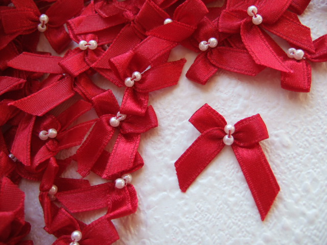 Lieve bordeaux rode satijnen strikjes met twee parel kraaltjes erop.
