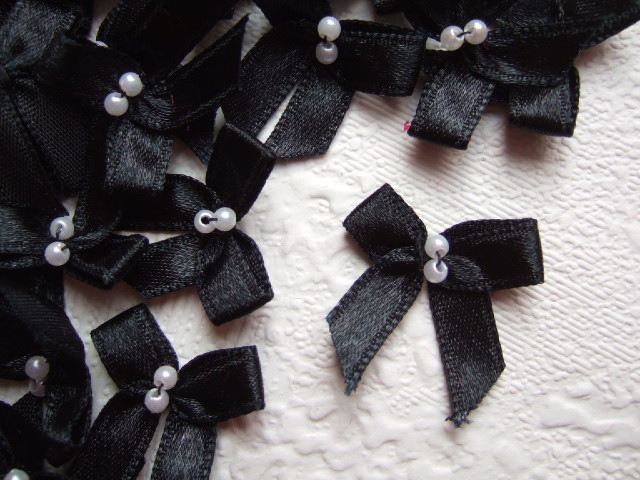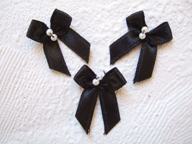 Lieve zwarte satijnen strikjes met twee parel kraaltjes erop.