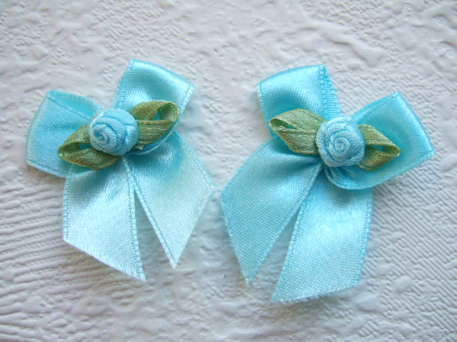 Schattig zacht aqua blauw satijnen strikje met in het midden een roosje op een groen blaadje.