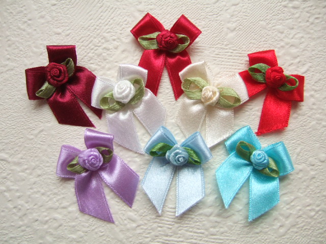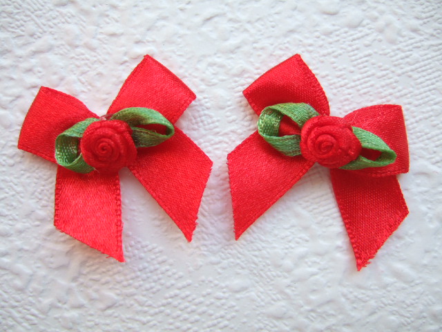 Schattig rood satijnen strikje met in het midden een roosje op een groen blaadje.