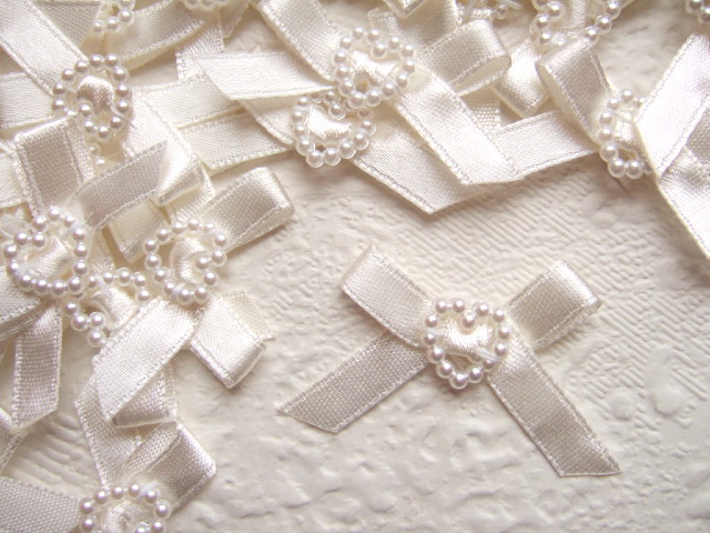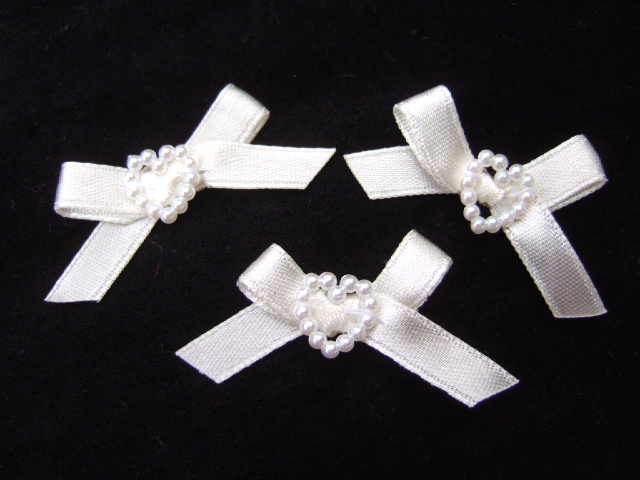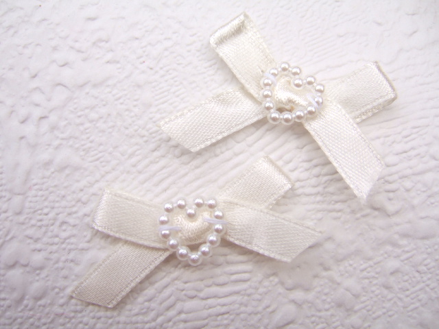 Schattige crème satijnen strikjes met witte “parel-kralen” hartjes.