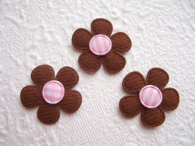 Licht gevulde bloemetjes van bruin kunstvilt, met een roze/wit geruit hartje.