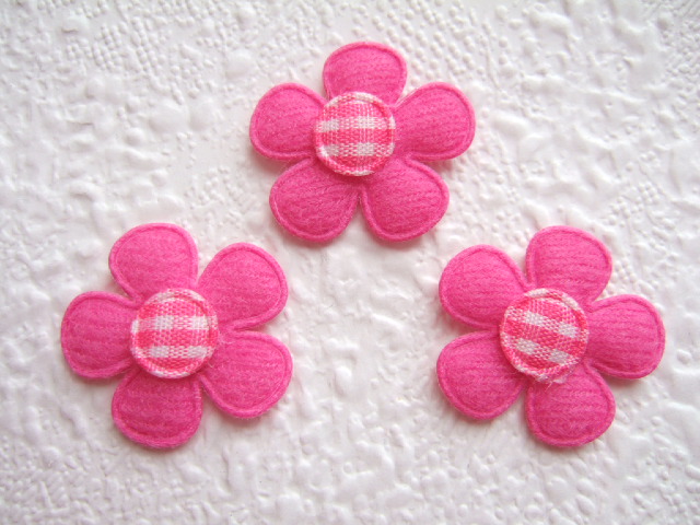 Licht gevulde bloemetjes van fuchsia roze kunstvilt, met een fuchsia/wit geruit hartje.