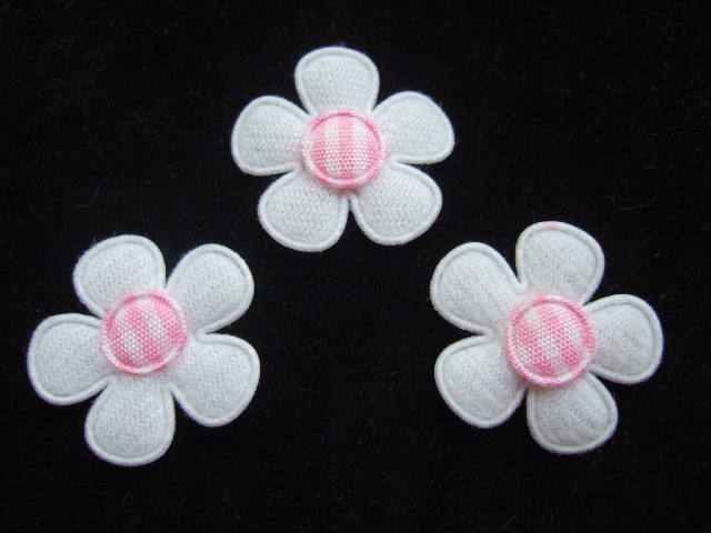 Licht gevulde bloemetjes van wit kunstvilt, met een roze/wit geruit hartje.