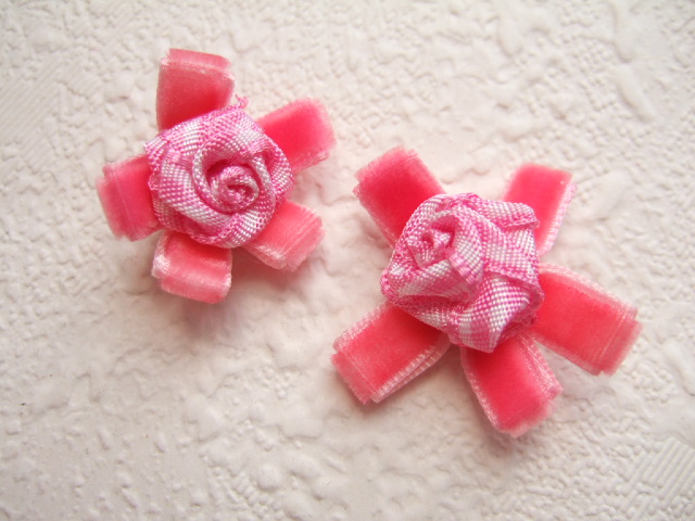 Lief bloemetje van warm roze velours band met daarop een roze wit geruit rossje.