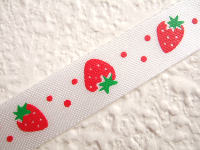 Stevig helder wit satijnband, bedrukt met rode aardbeien.