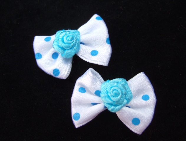 Leuke wit satijnen polkadots strikjes met aqua blauw satijnen roosje erop.