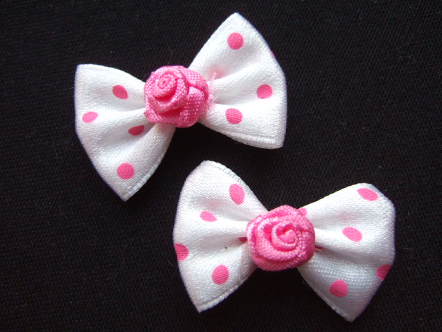 Leuke wit satijnen polkadots strikjes met roze satijnen roosje erop.