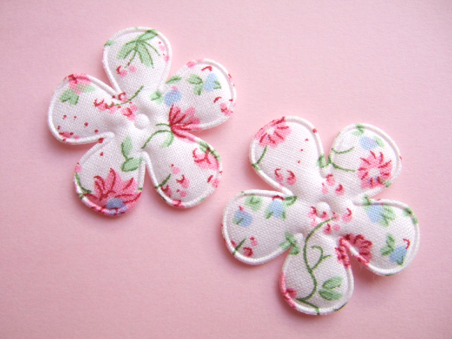 Mooie licht gevulde witte bloemen, bedrukt met fuchsia roze en blauwe voorjaars bloemetjes met groen blad.