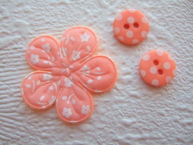 Mooie zacht oranje / zalm roze bloemen, bedrukt met fijne witte bloemetjes.