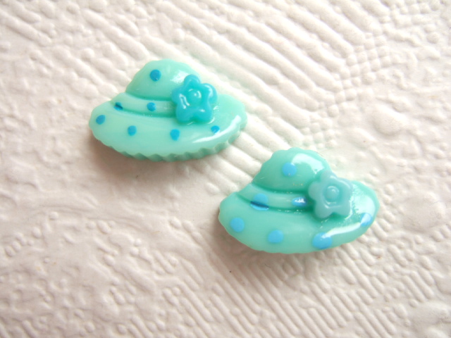 Kleine zonnige flatbacks van een mint blauw groen polkadots zonnehoedje met bloemetje.