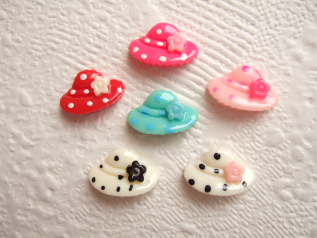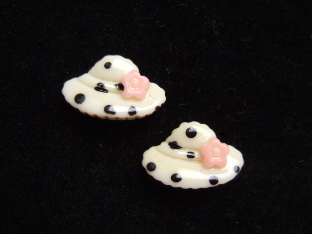 Kleine zonnige flatback van een ivoor polkadots zonnehoedje met roze bloemetje.